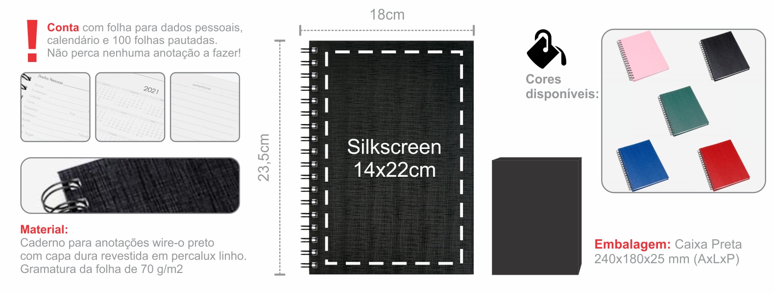 Caderno para anotações wire-o preto com capa dura revestida em percalux linho. Conta com folha para dados pessoais e 100 folhas pautadas. Gramatura da folha de 70 g/m2