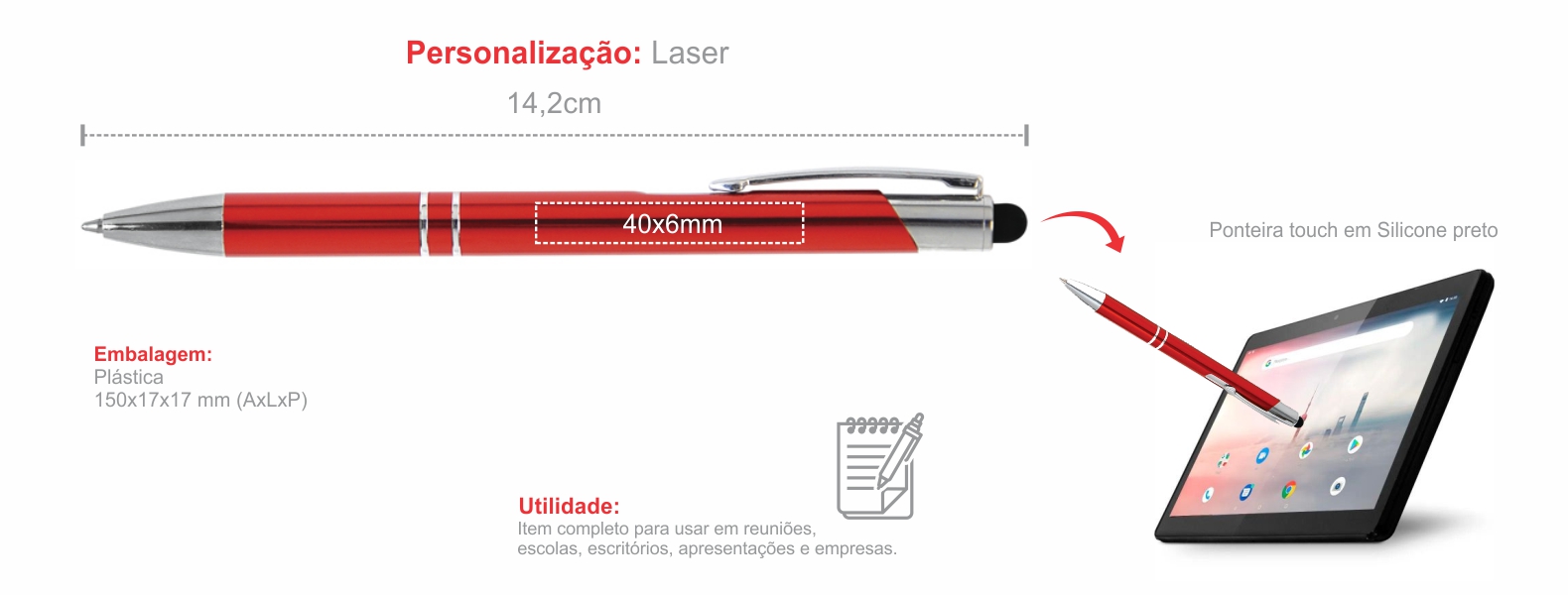 Caneta esferográfica em alumínio vermelha. Conta com acabamento cromado, clipe em Metal e ponteira touch em silicone preto. Carga esferográfica azul acionada por um click na extremidade da caneta.