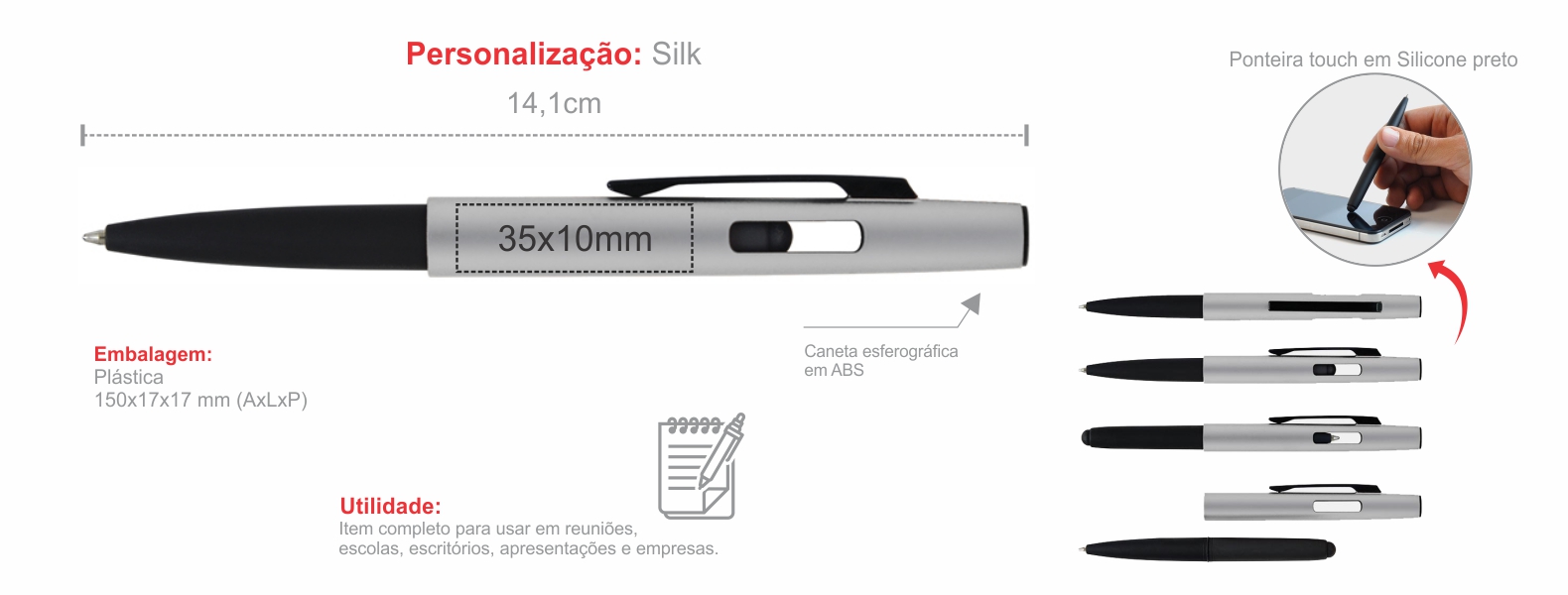 Caneta esferográfica em ABS prata. Conta com tampa com abertura nas laterais, acabamento fosco, clipe em metal e ponteira touch em Silicone preto. Carga esferográfica azul.