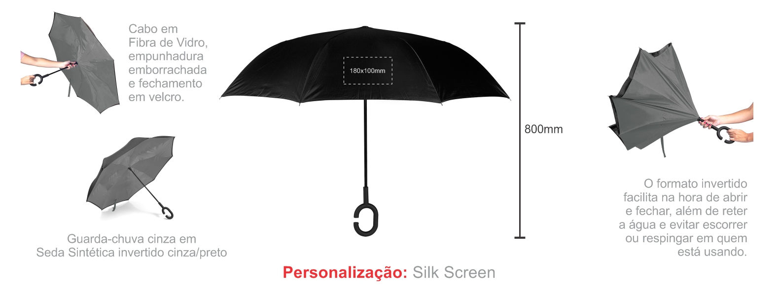 Guarda-chuva cinza em Seda Sintética invertido cinza/preto com cabo em Fibra de Vidro, empunhadura emborrachada, hastes em plástico resistente e fechamento em velcro. O formato invertido facilita na hora de abrir e fechar, além de reter a água e evitar escorrer ou respingar em quem está usando.