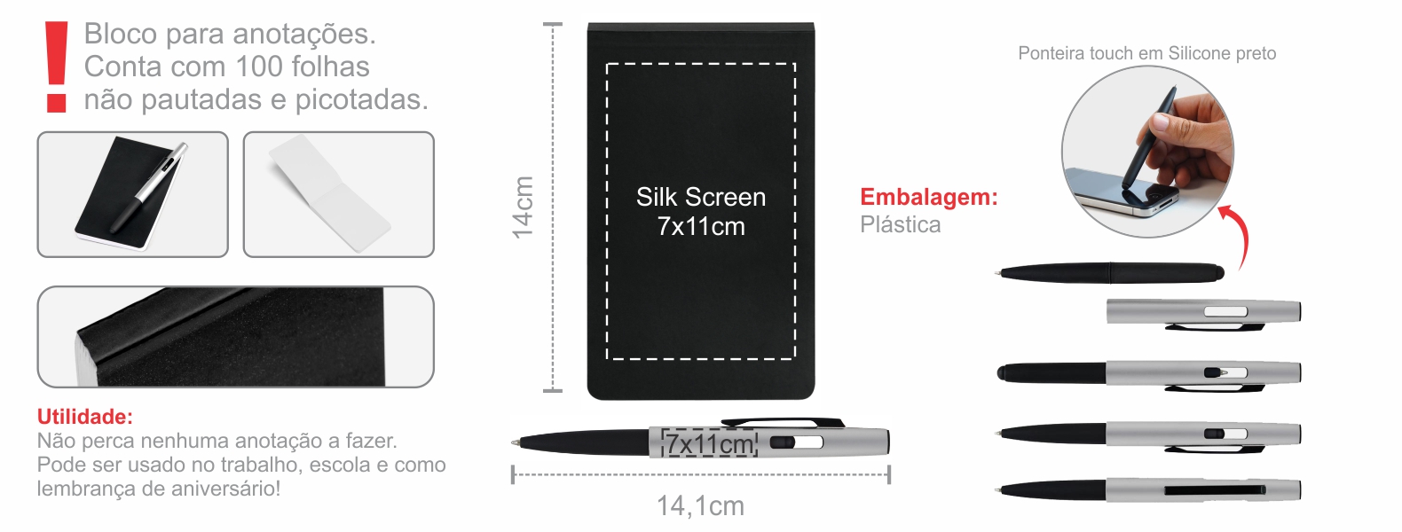 Bloco para anotações com caneta. O bloco conta com 100 folhas não pautadas. Caneta esferográfica em ABS prata. Conta com tampa com abertura nas laterais, acabamento fosco, clipe em Metal e ponteira touch em Silicone preto. Carga esferográfica azul.
