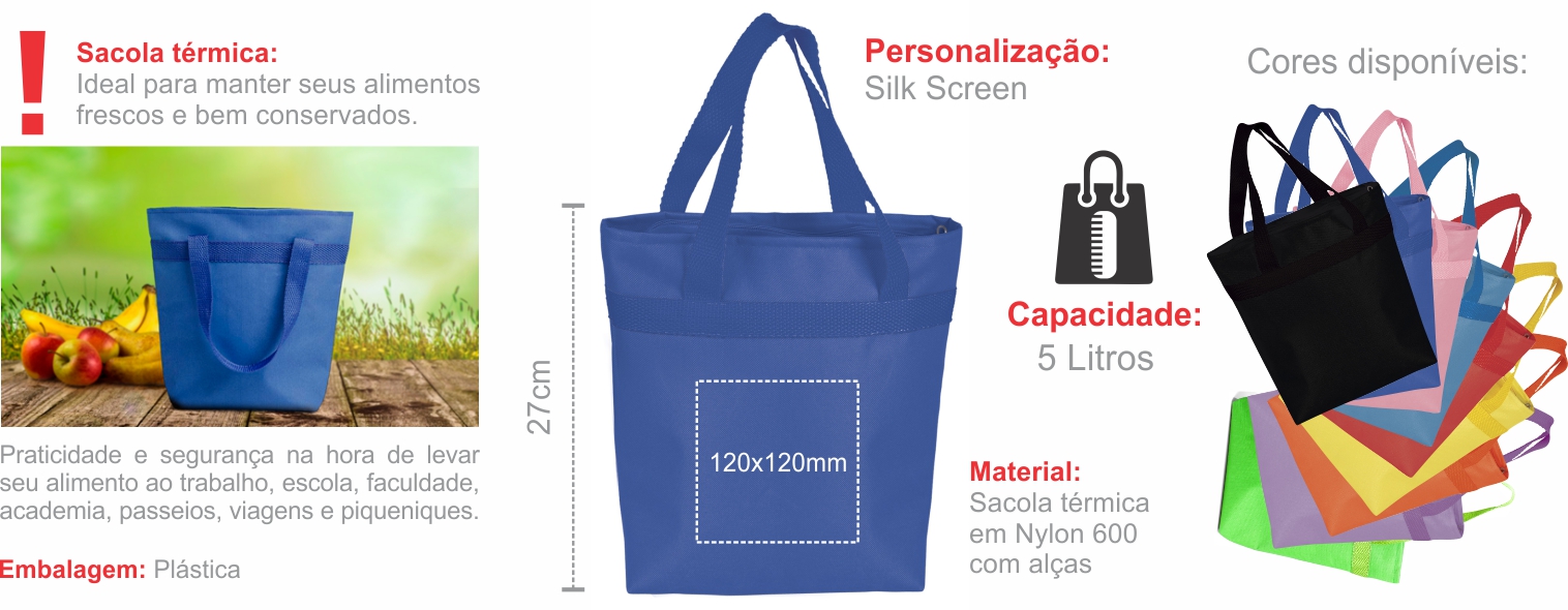 Sacola térmica em nylon 600 azul com alças e capacidade total aproximada de 5 litros.