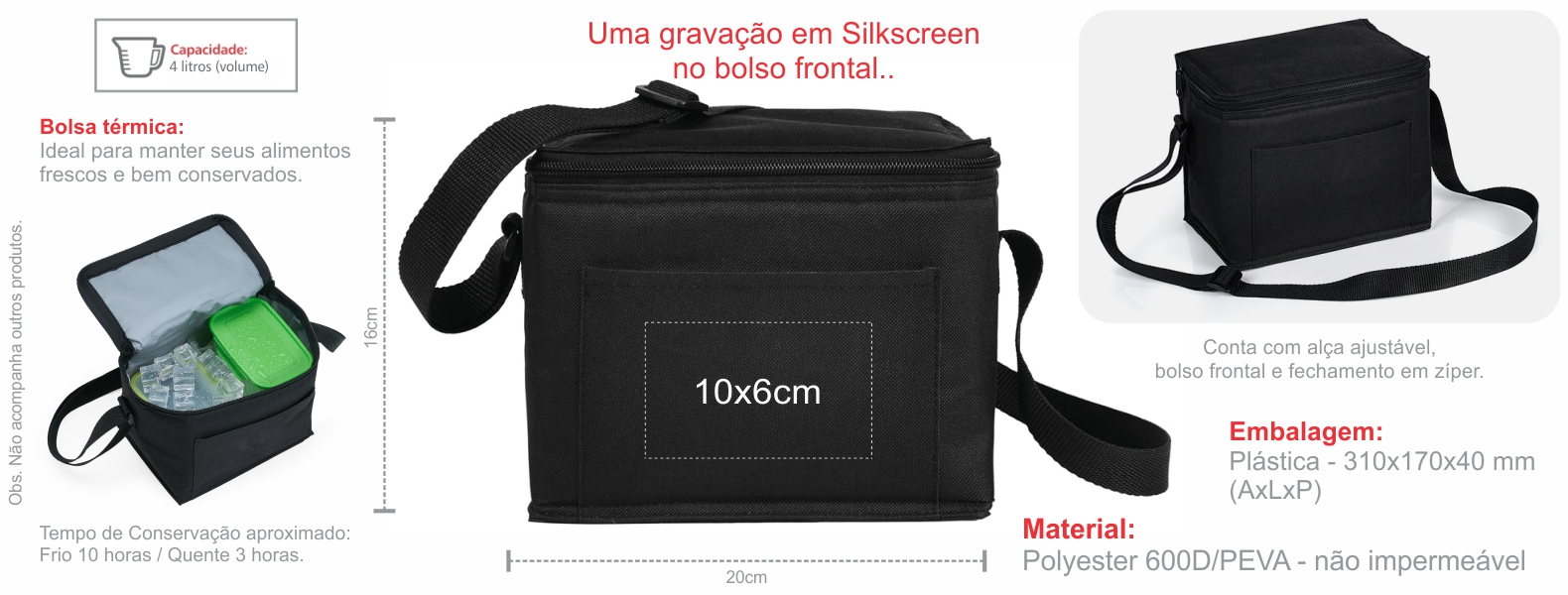Bolsa Térmica preta em Polyester 600D/PEVA - não impermeável. Conta com alça ajustável, bolso frontal e fechamento em zíper. Forro interno soldado (não vaza) cinza feito de PEVA. Tempo de conservação aproximado: Frio 10 horas / Quente 3 horas.