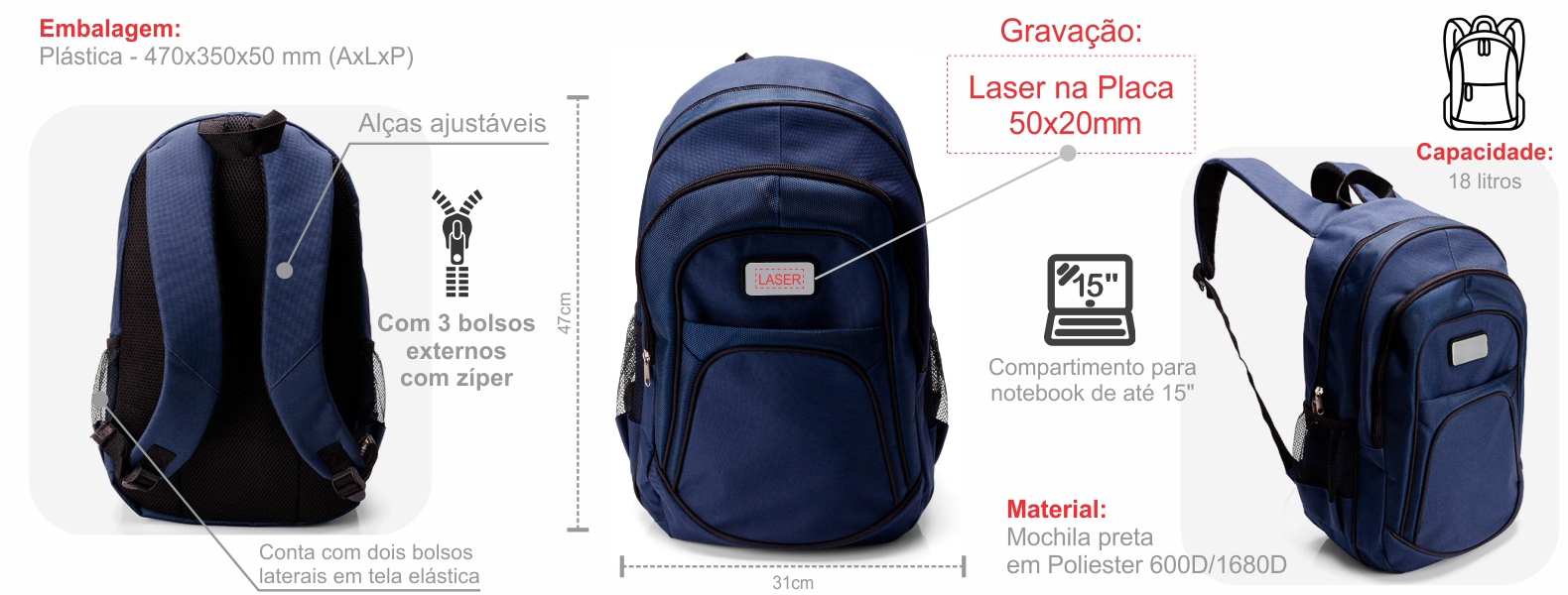 Mochila azul em Poliester 600D/1680D com alças para as costas, alça para as mãos, compartimento para notebook de até 15", 3 bolsos externos com zíper e 2 bolsos externos em tela. Utilidade do Produto: Uma mochila ideal para quem precisa de conforto, praticidade e organização no trabalho, nas viagens e no dia a dia.