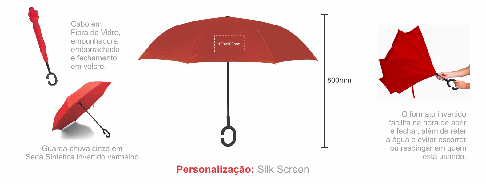 Guarda-chuva vermelho em Seda Sintética invertido cinza/preto com cabo em Fibra de Vidro, empunhadura emborrachada, hastes em plástico resistente e fechamento em velcro. O formato invertido facilita na hora de abrir e fechar, além de reter a água e evitar escorrer ou respingar em quem está usando.