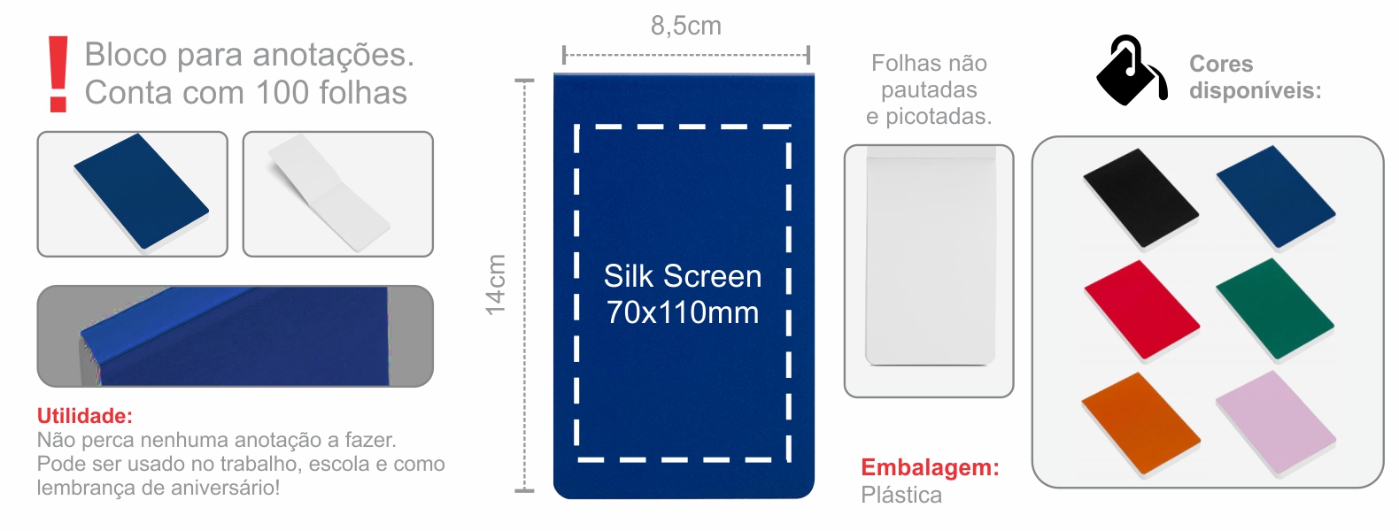 Bloco para anotações azul. Conta com 100 folhas não pautadas.