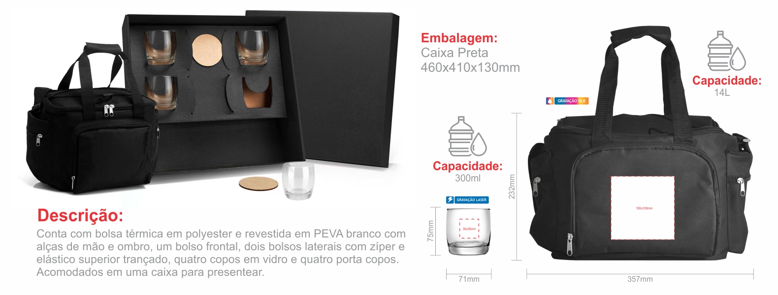 Conta com bolsa térmica em poliester e revestida em PEVA branco com alças de mão e ombro, um bolso frontal, dois bolsos laterais com zíper e elástico superior trançado, quatro copos em vidro e quatro porta copos. Acomodados em uma caixa para presentear.