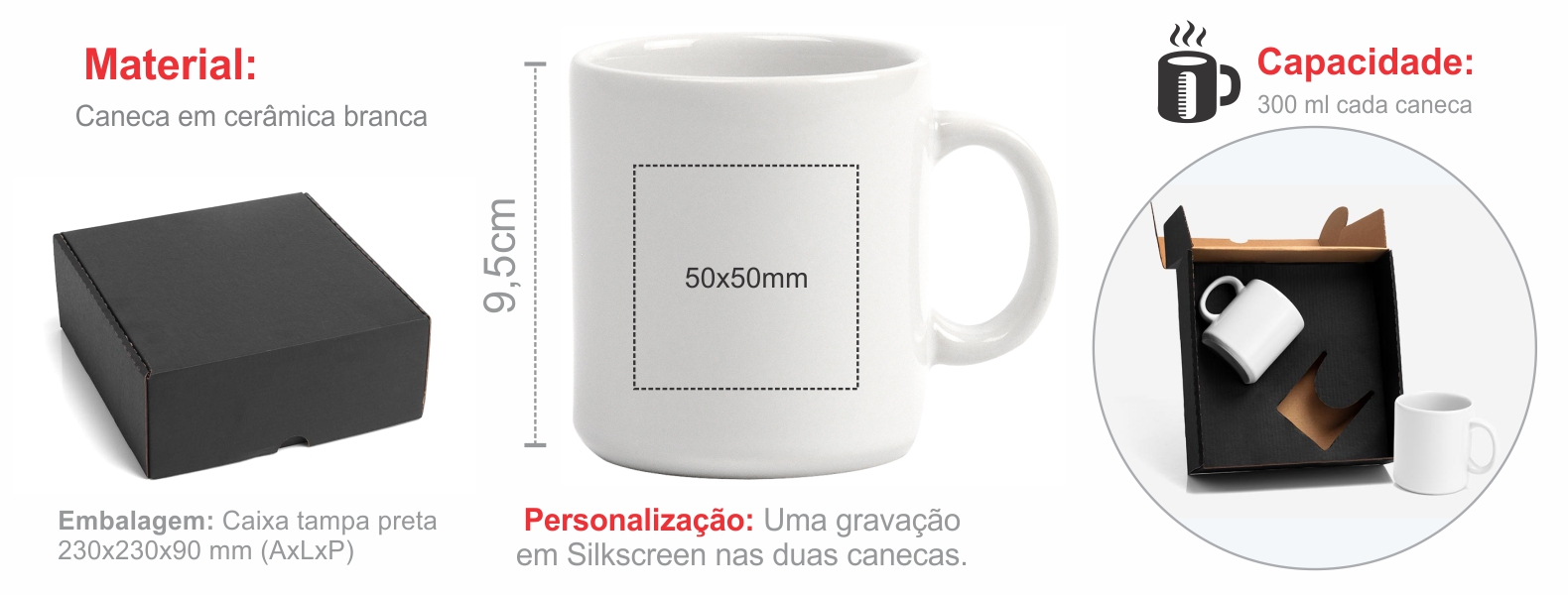 Kit contendo 2 canecas em cerâmica branca. Capacidade: 270 ml cada.