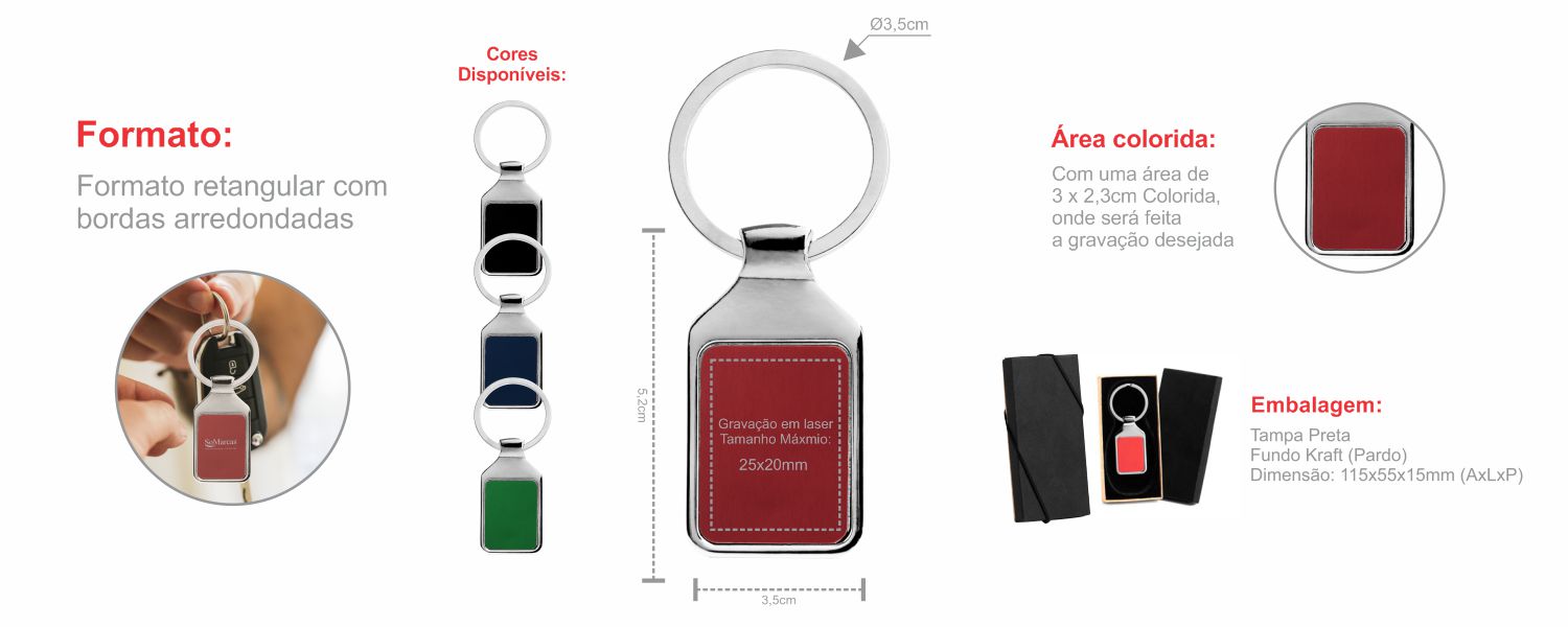 Chaveiro em metal cromado com detalhe vermelho. Está acomodado em uma embalagem interna aveludada.