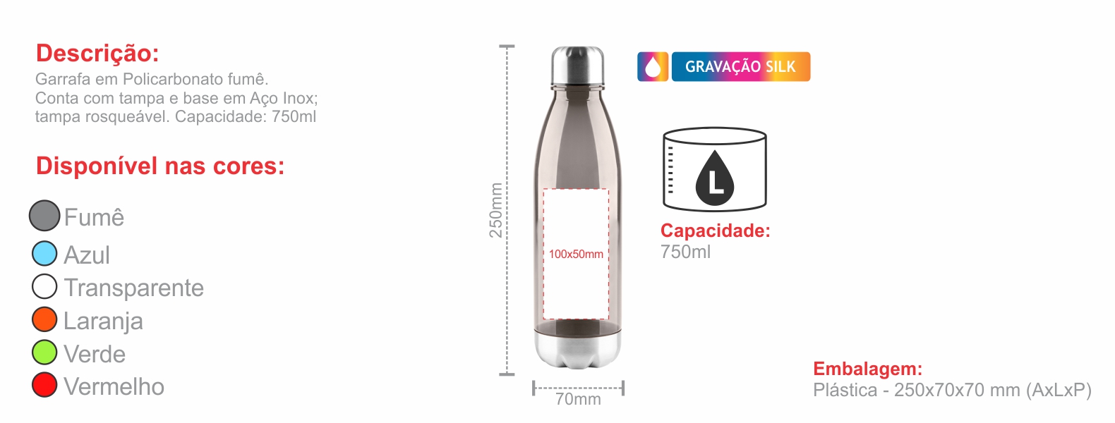 Garrafa em Policarbonato fumê. Conta com tampa e base em Aço Inox; tampa rosqueável. Capacidade: 750ml