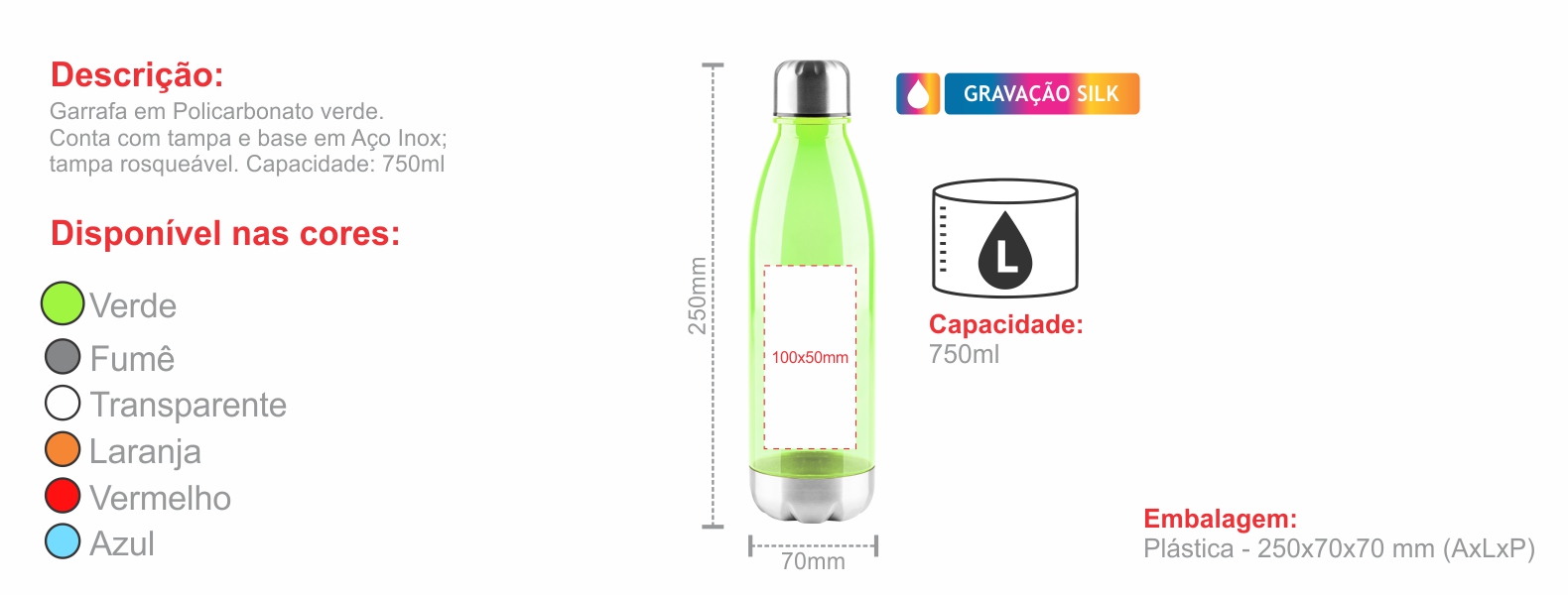 Garrafa em Policarbonato verde. Conta com tampa e base em Aço Inox; tampa rosqueável. Capacidade: 750ml