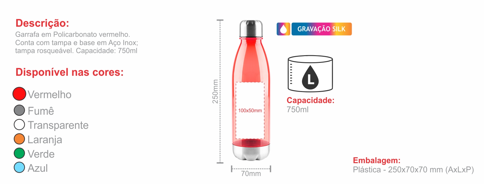 Garrafa em Policarbonato vermelha. Conta com tampa e base em Aço Inox; tampa rosqueável. Capacidade: 750ml