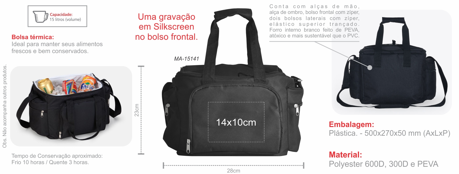 Bolsa Térmica preta em Polyester 600D, 300D e PEVA. Conta com alças de mão, alça de ombro, bolso frontal com zíper, dois bolsos laterais com zíper, elástico superior trançado. Forro interno branco soldado (não vaza) feito de PEVA, atóxico e mais sustentável que o PVC. Tempo de Conservação aproximado: Frio 10 horas / Quente 3 horas.