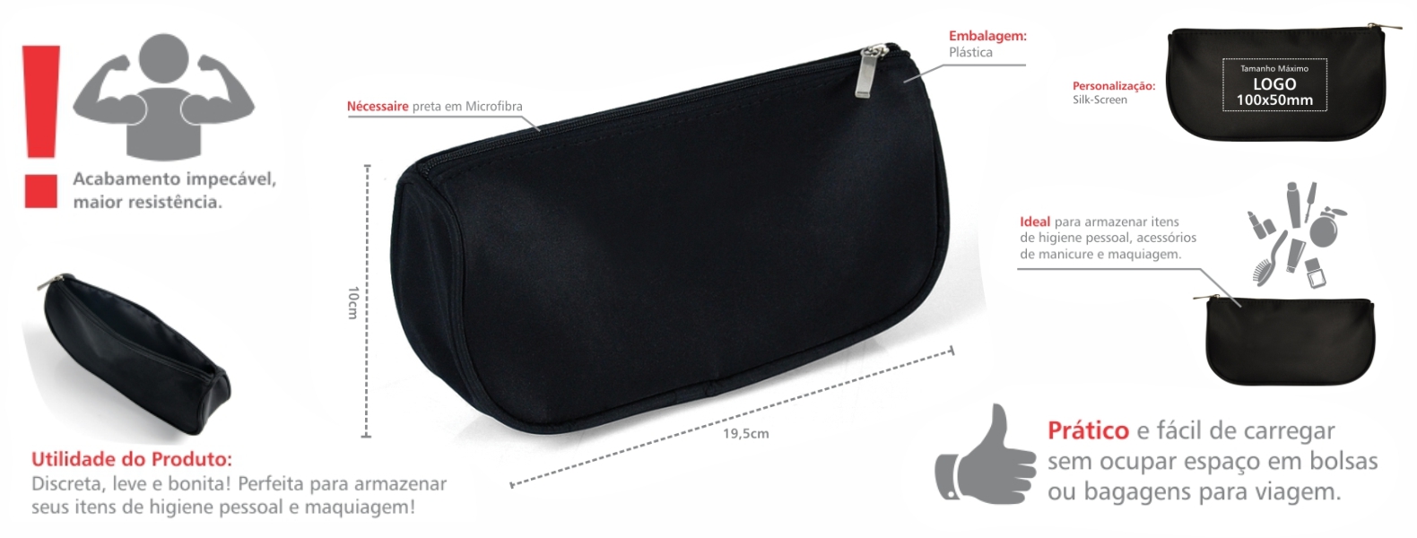 Confeccionada em microfibra preto, possui forro em nylon e zíper superior; É leve de porte pequeno, ideal para armazenar itens de higiene pessoal, maquiagem ou até ferramentas.
