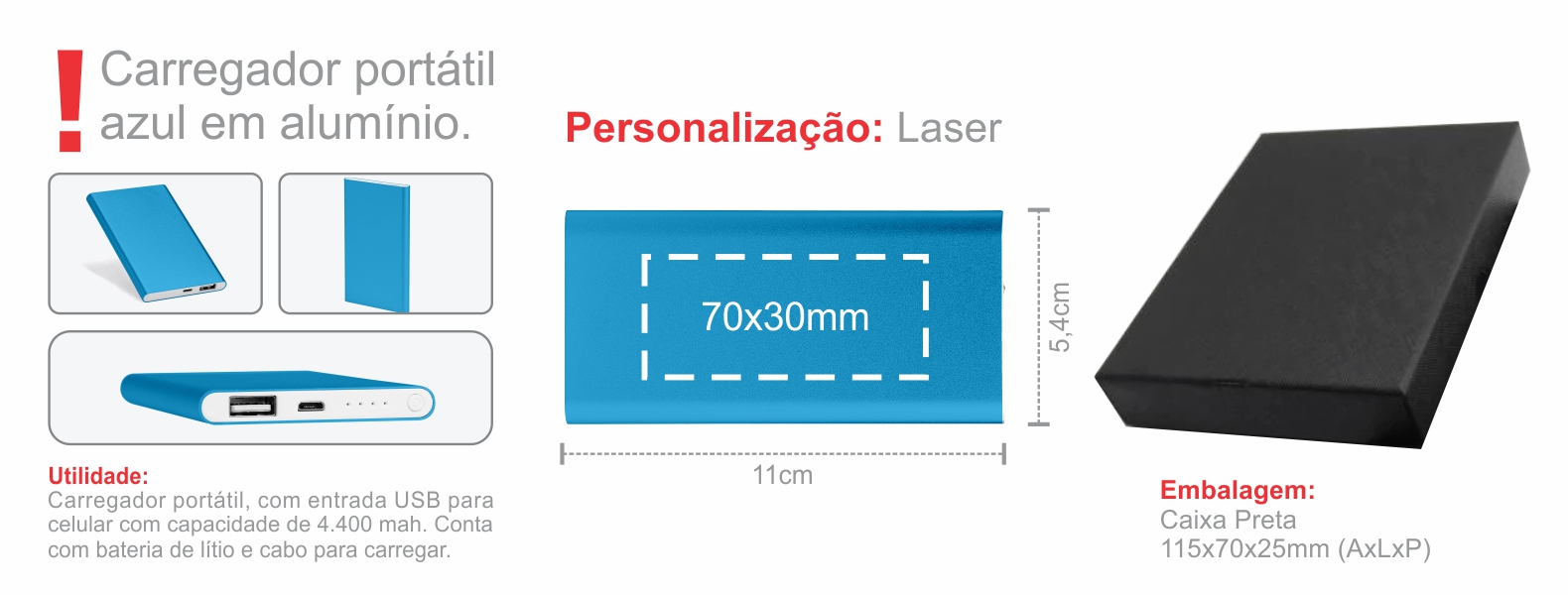 Carregador portátil azul em Alumínio. Conta com bateria de lítio; cabo para carregar; capacidade de 4.400 mAh. Disponível nas cores: prata, preto, azul, vermelho e champagne.