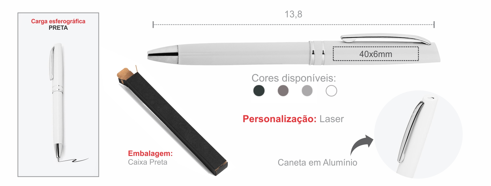 Caneta em alumínio. Conta com carga esferográfica preta. Disponível nas cores: branca, preta, chumbo e prata.