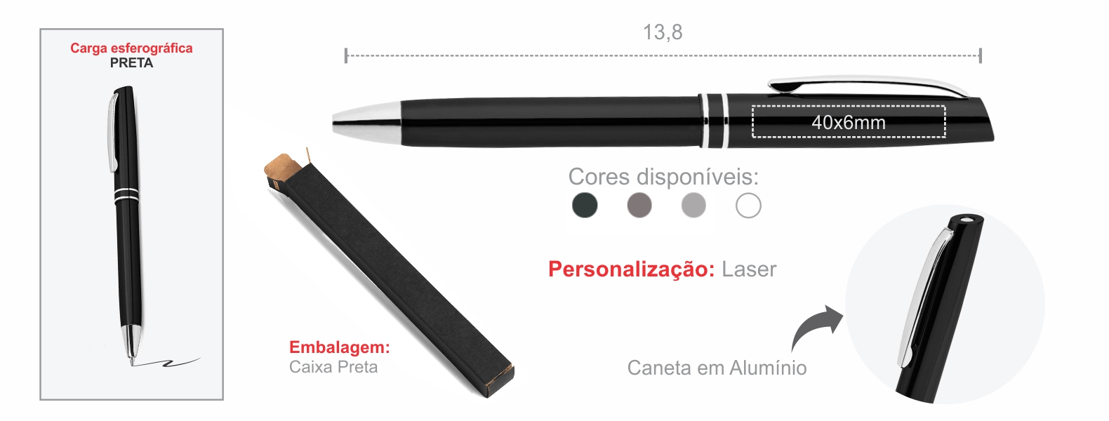 Caneta em alumínio. Conta com carga esferográfica preta. Disponível nas cores: branca, preta, chumbo e prata.