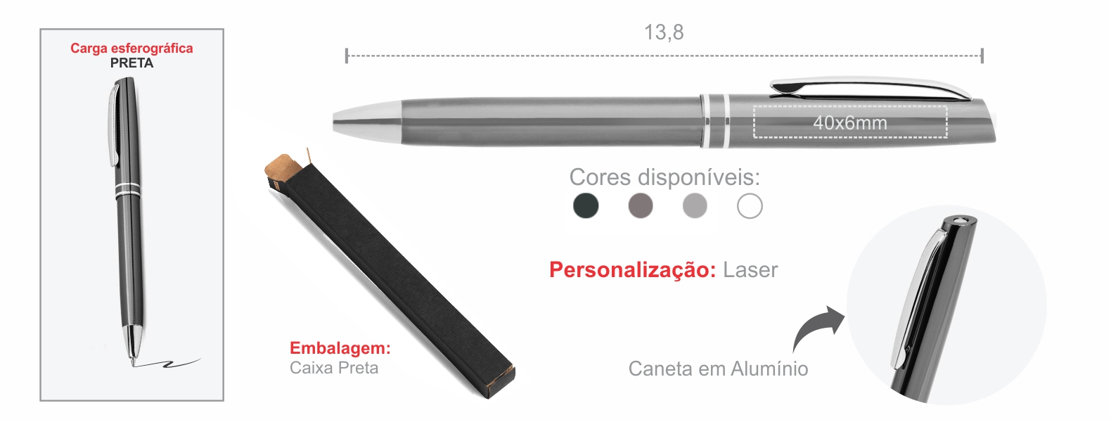 Caneta em alumínio. Conta com carga esferográfica preta. Disponível nas cores: branca, preta, chumbo e prata.