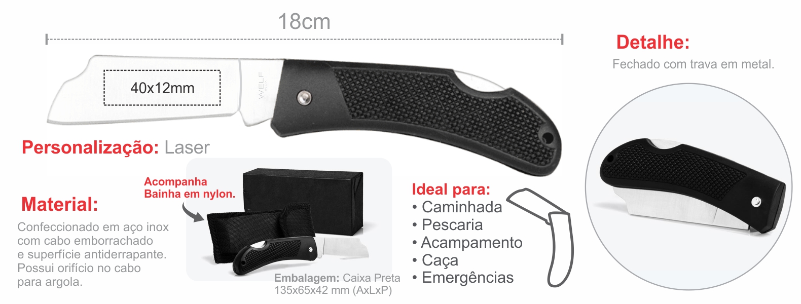 Canivete de 3 polegadas em aço inox com cabo emborrachado e bainha em nylon.