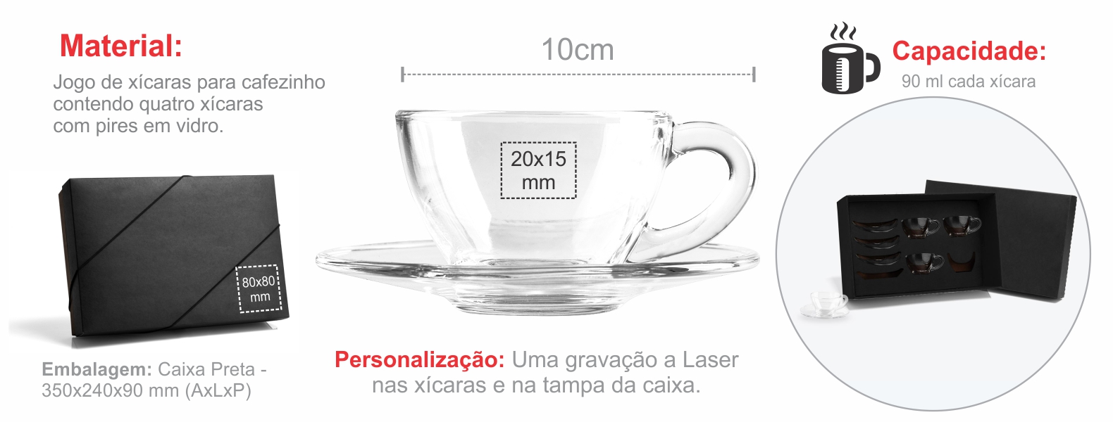 Jogo de xícaras. Kit para café contendo quatro xícaras com pires em vidro. Capacidade: 90 ml cada xícara.