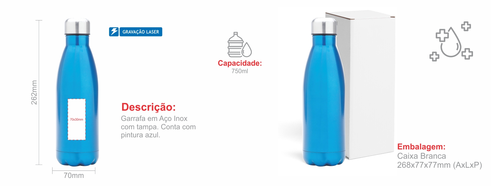 Garrafa em Aço Inox com tampa. Conta com pintura em azul. Capacidade: 750ml