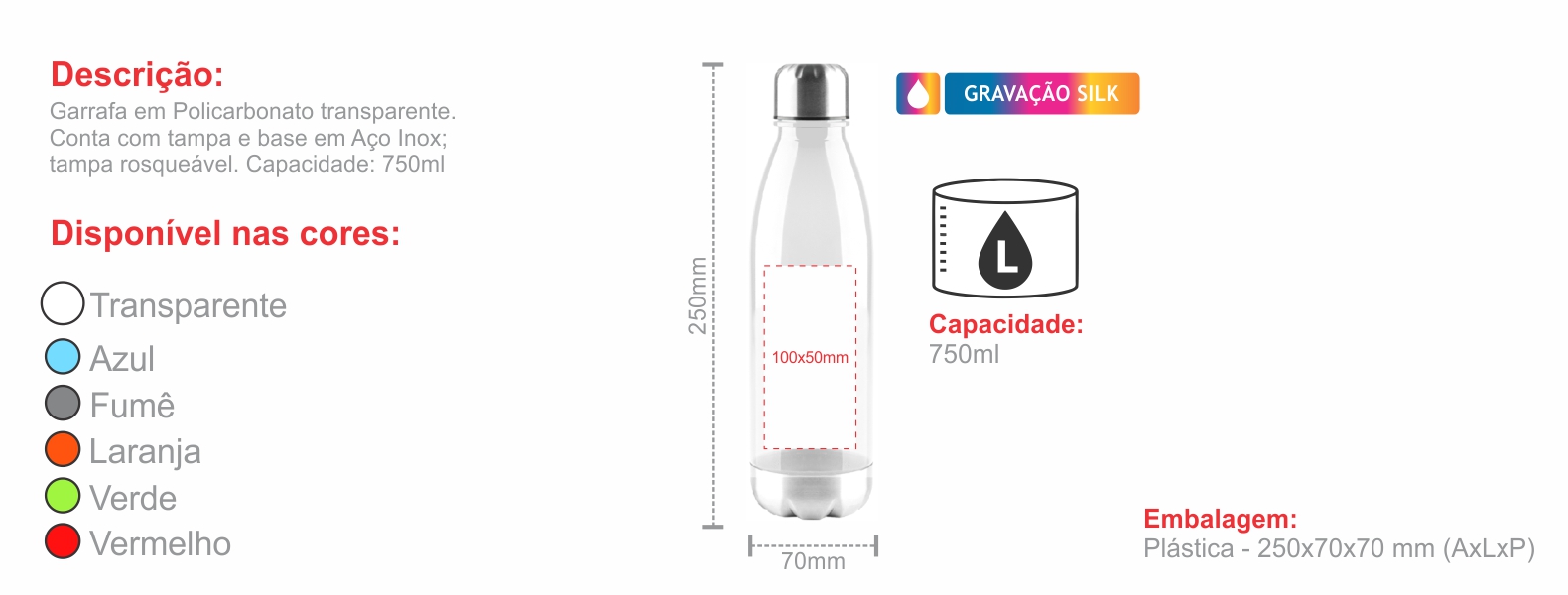 Garrafa em Policarbonato transparente. Conta com tampa e base em Aço Inox; tampa rosqueável. Capacidade: 750ml