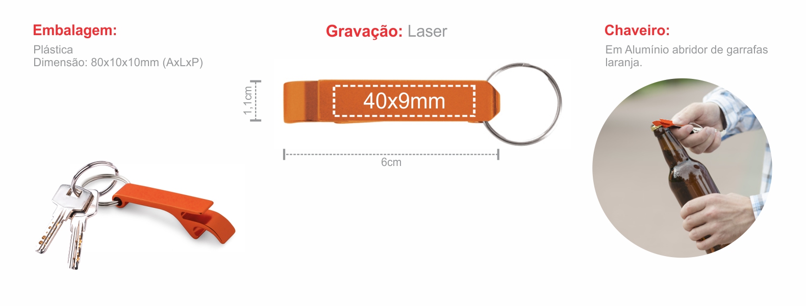 Chaveiro em alumínio laranja. Conta com abridor para garrafa e latinhas.