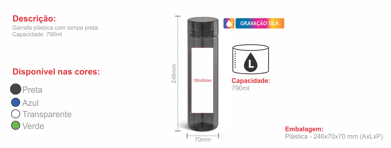 Garrafa plástica com tampa preta. Capacidade: 790ml