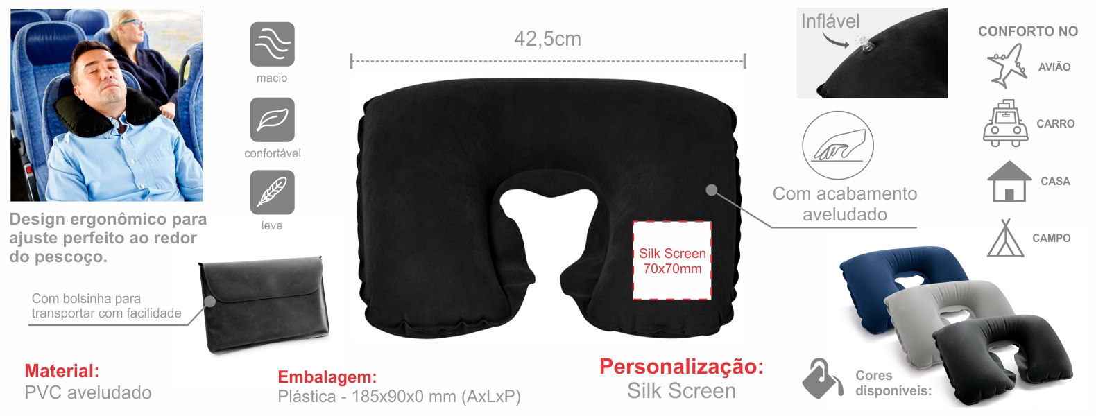 Almofada de pescoço inflável em PVC preto. Conta com acabamento aveludado e bolsa.