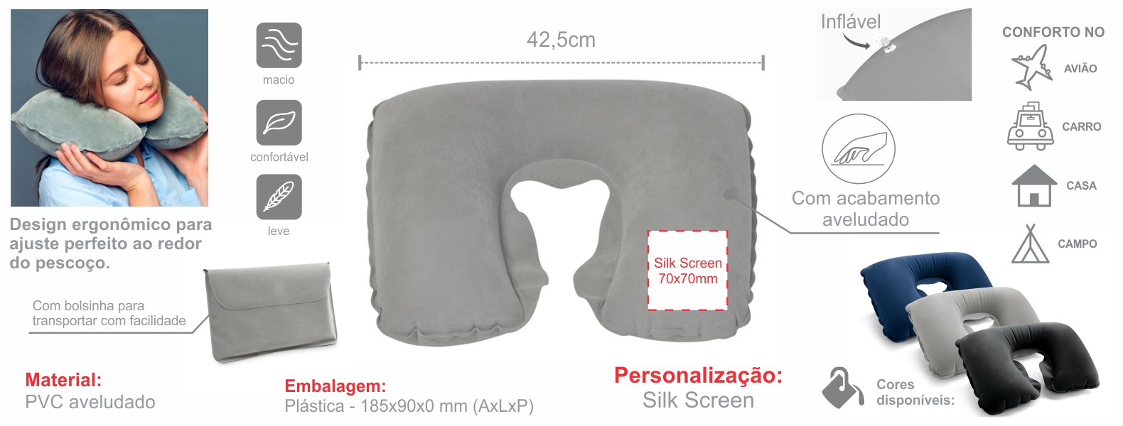 Almofada de pescoço inflável em PVC cinza. Conta com acabamento aveludado e bolsa.