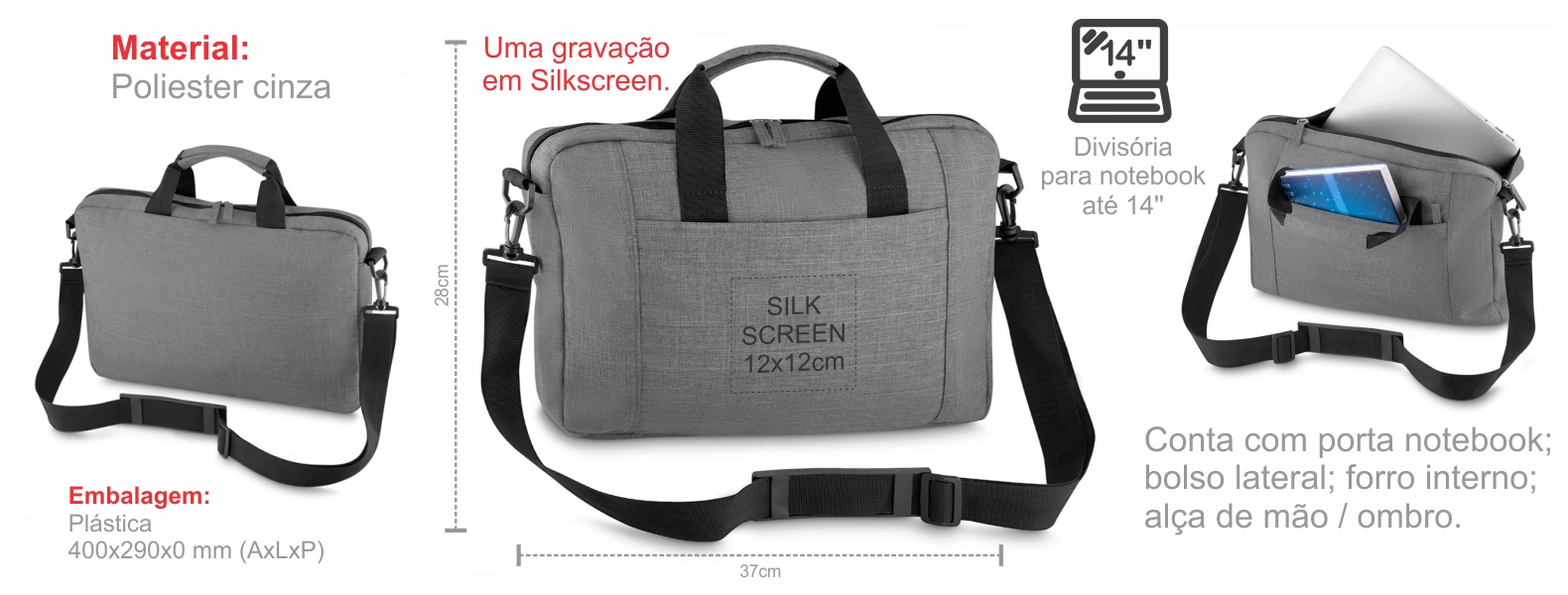 Pasta executiva em Poliester cinza. Conta com porta notebook; bolso lateral; forro interno; alça de mão / ombro.