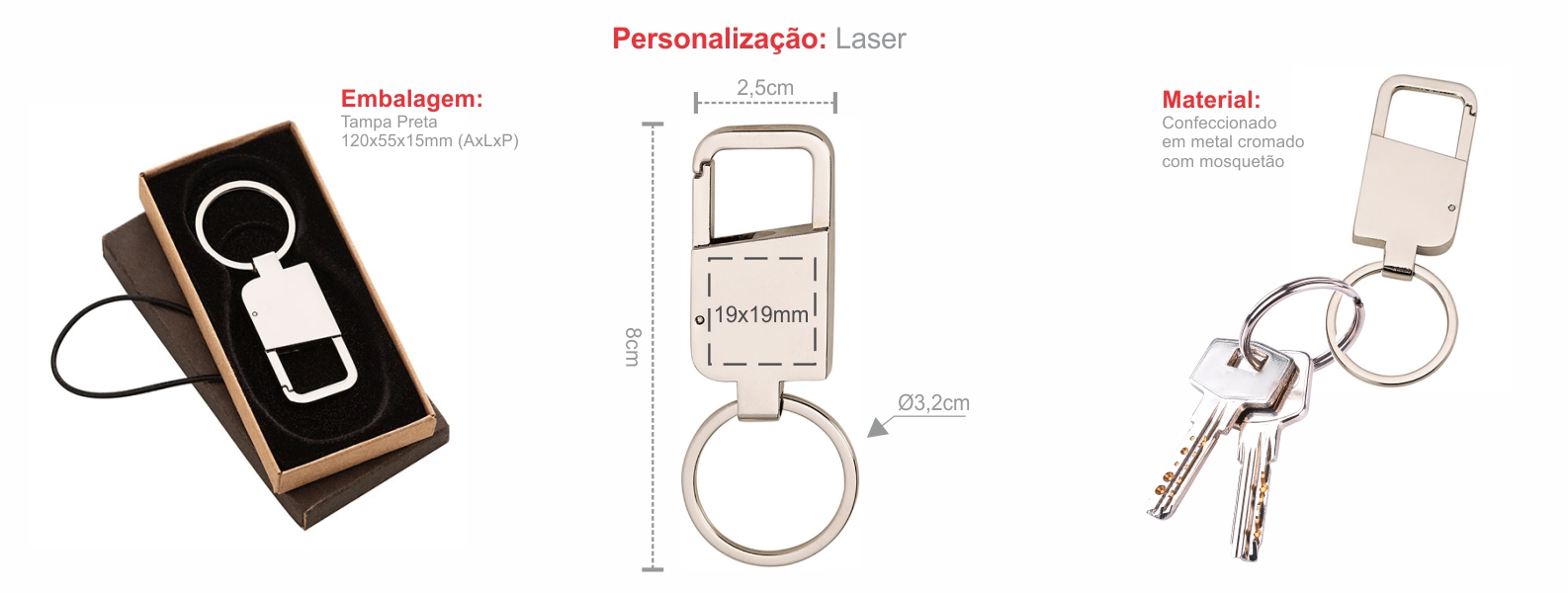 Chaveiro em metal cromado com mosquetão. Está acomodado em uma embalagem interna aveludada.