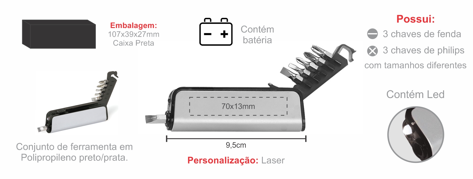 Conjunto de ferramenta em Polipropileno preto/prata. Possui duas chaves de fenda, duas chaves philips, duas chaves allen em tamanhos variados e LED.