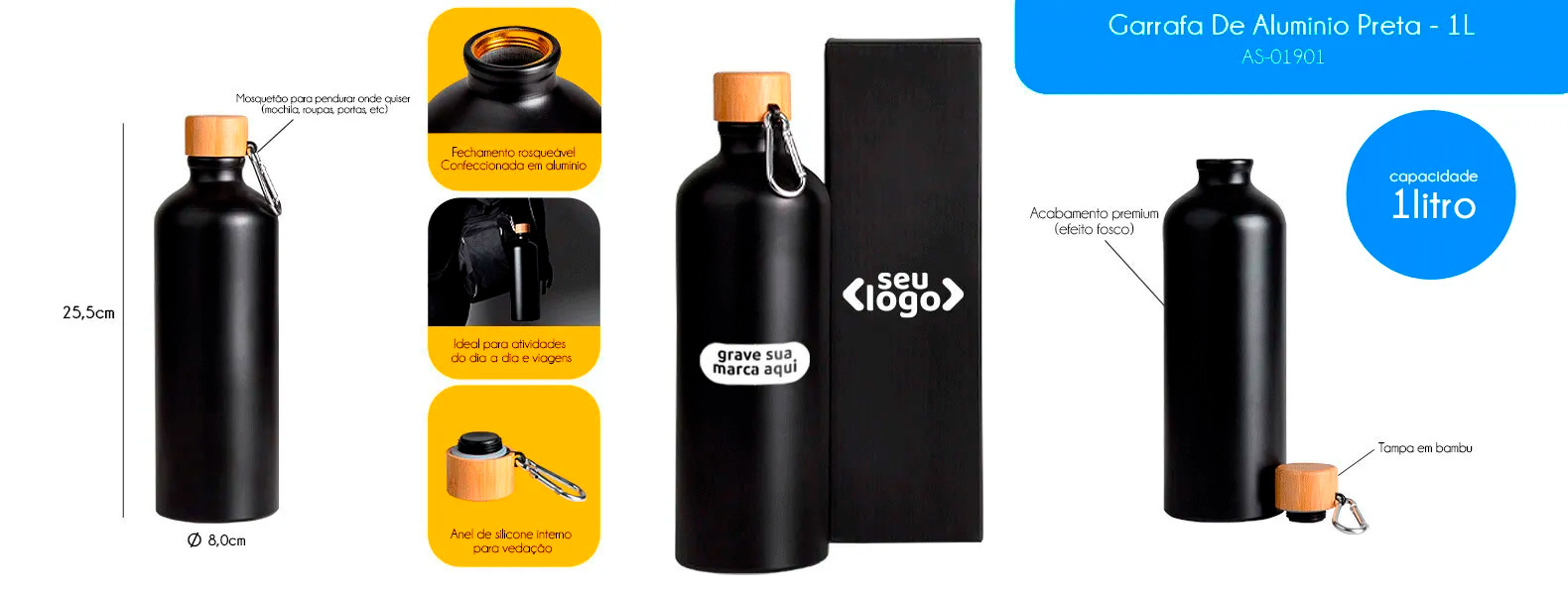 Garrafa em alumínio na cor preta com capacidade de 1 litro. Possui tampa rosqueável em Bambu com mosquetão.