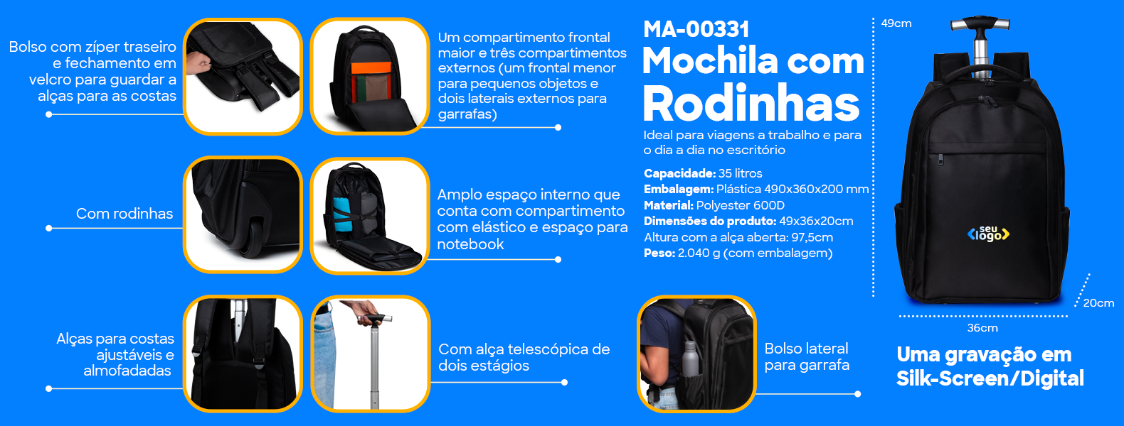 Mochila preta com rodinhas. Conta com alça para as costas fechada com zíper, alça para mãos, alça telescópica de dois estágios, duas rodinhas, proteção para as rodinhas com velcro, quatro compartimentos - sendo um interno principal (com sub compartimento para notebook) e três externos (um frontal menor para pequenos objetos como celulares e cadernos, e dois laterais, ideais para guarda-chuvas e garrafas).