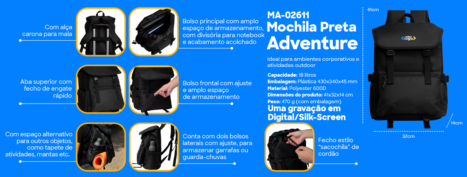 Mochila preta confeccionada em Polyester 600D. Conta com bolso principal com fechamento com cordão e aba com fecho de engate rápido, bolso frontal com ajuste, 2 bolsos laterais com ajuste para controlar o volume da mochila, alças ajustáveis, alça de mão e alça carona para mala. Espaço interno com divisória para notebook com acabamento acolchado.
