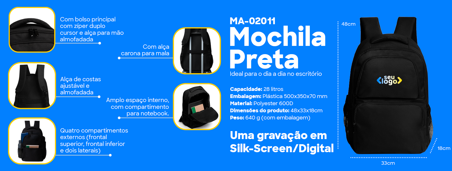 Mochila preta confeccionada em Polyester 600D. Conta com bolso principal com zíper duplo cursor, dois bolsos frontais em zíper, dois bolsos laterais em tela, divisória para notebook de até 15" interna com acabamento acolchoado, alças ajustáveis, alça de mão e alça carona para mala.