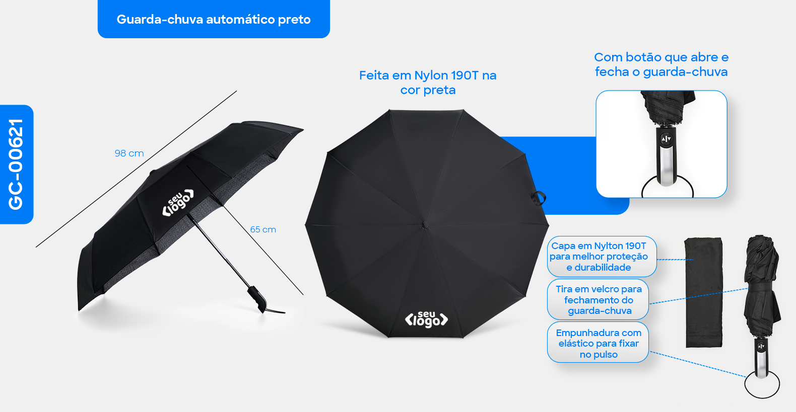 Guarda-chuva confeccionado em Nylon 190T na cor preta. Conta com ativação automática ao pressionar um botão, tanto para abrir quanto para fechar; empunhadura confortável com elástico para fixar no pulso, diminuindo o risco de queda e aumentando a segurança; fechamento em velcro; capa em Nylon para melhor proteção e durabilidade.