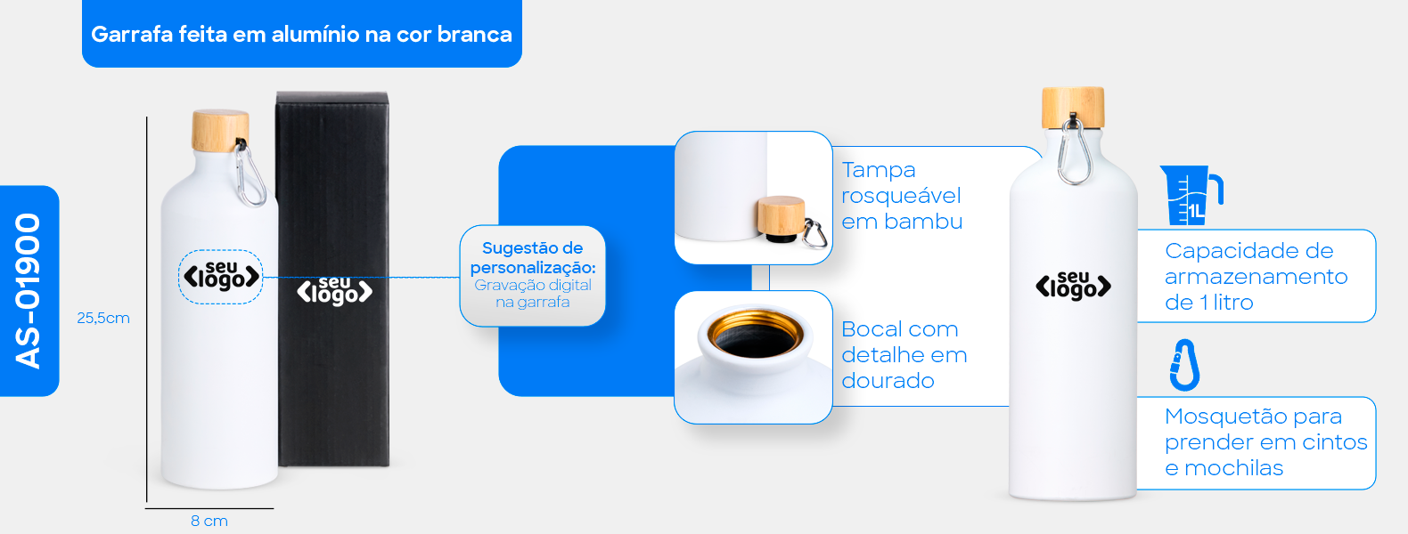 Garrafa em alumínio na cor branca com capacidade de 1 litro. Possui tampa rosqueável em Bambu com mosquetão.