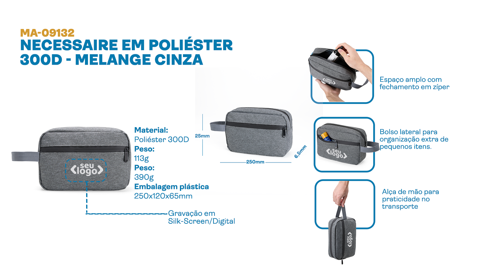 Necessaire cinza. Conta com compartimento principal e bolso lateral, ambos com o fecho em zíper e alça de mão.