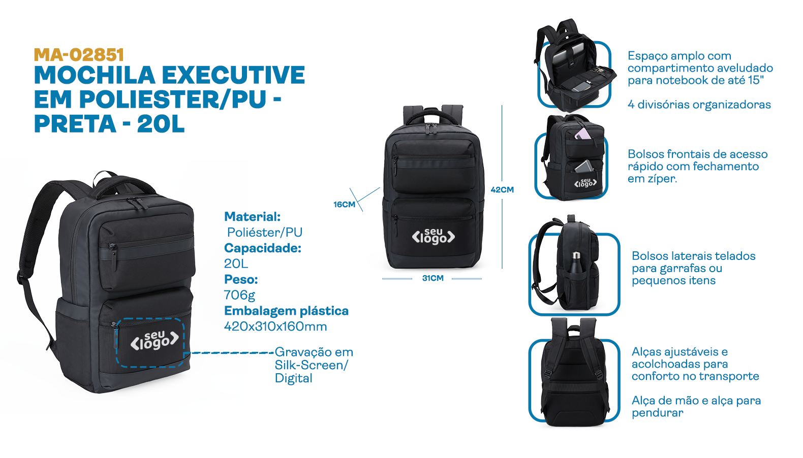 Mochila preta em Polyester / PU. Conta com alças para as costas e bolso, alça para as mãos, alça para pendurar e alça carona para mala. Na parte externa conta com saída para fio, faixa refletiva, borrachão, dois fechos laterais, dois bolsos laterais com tela, bolso frontal e dois bolsos na parte superior com fechamento em zíper. Na parte interna do primeiro bolso, conta com 4 compartimentos. No bolso principal, conta com compartimento aveludado para notebook de até 15" e mais um compartimento.