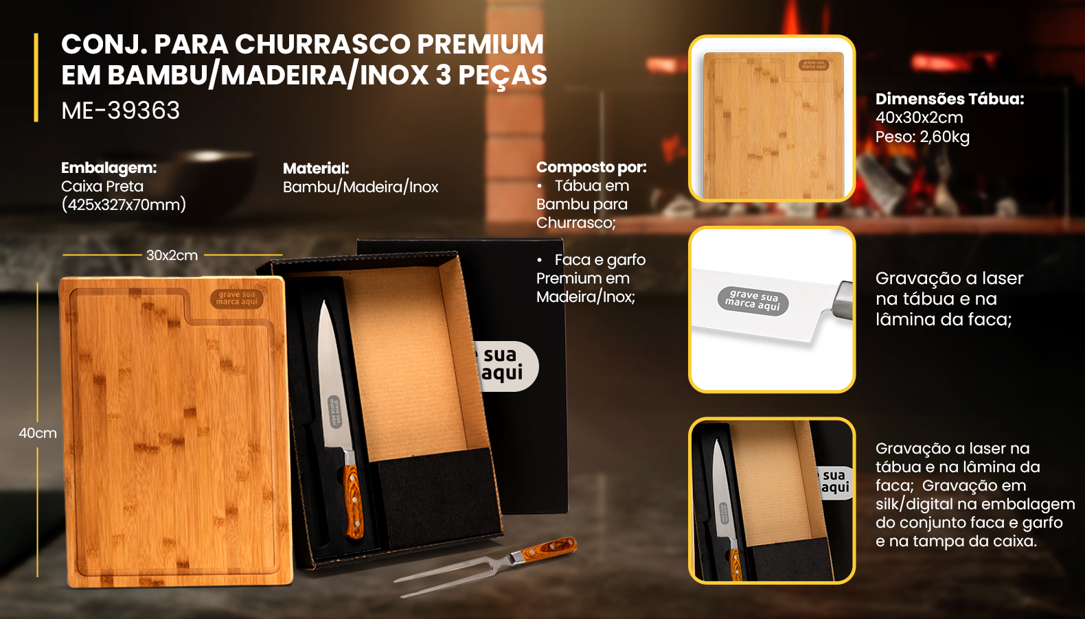 Conjunto para Churrasco. Composto por tábua em Bambu para Churrasco; faca e garfo premium em Madeira / Inox.