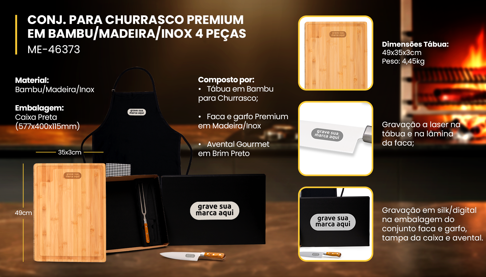 Conjunto para Churrasco. Composto por tábua em Bambu para Churrasco; faca e garfo premium em Madeira / Inox. Conta também com avental Gourmet em Brim preto.