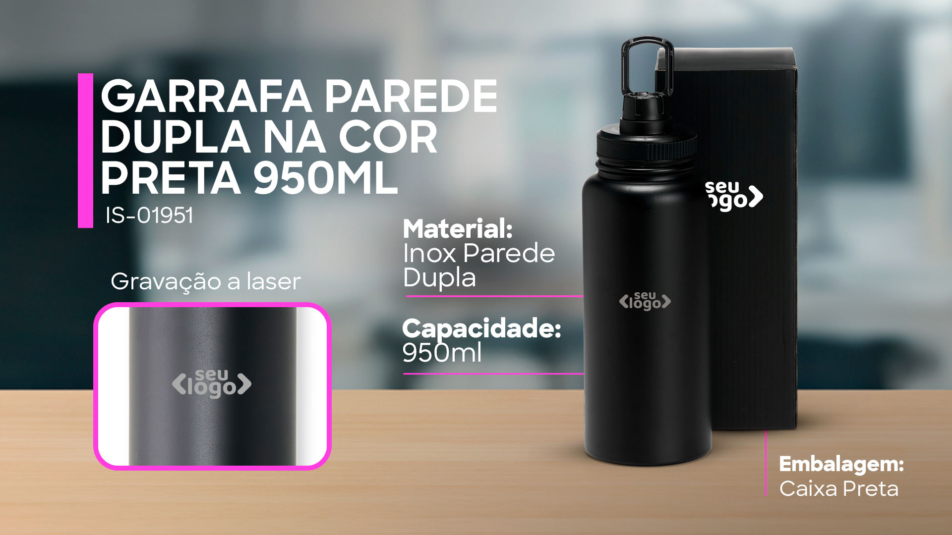 Garrafa em Inox na cor preta, confeccionada com dupla camada. Conta com tampa rosqueável, bico com uma segunda tampa e alça. Mantém a temperatura da bebida por mais tempo.