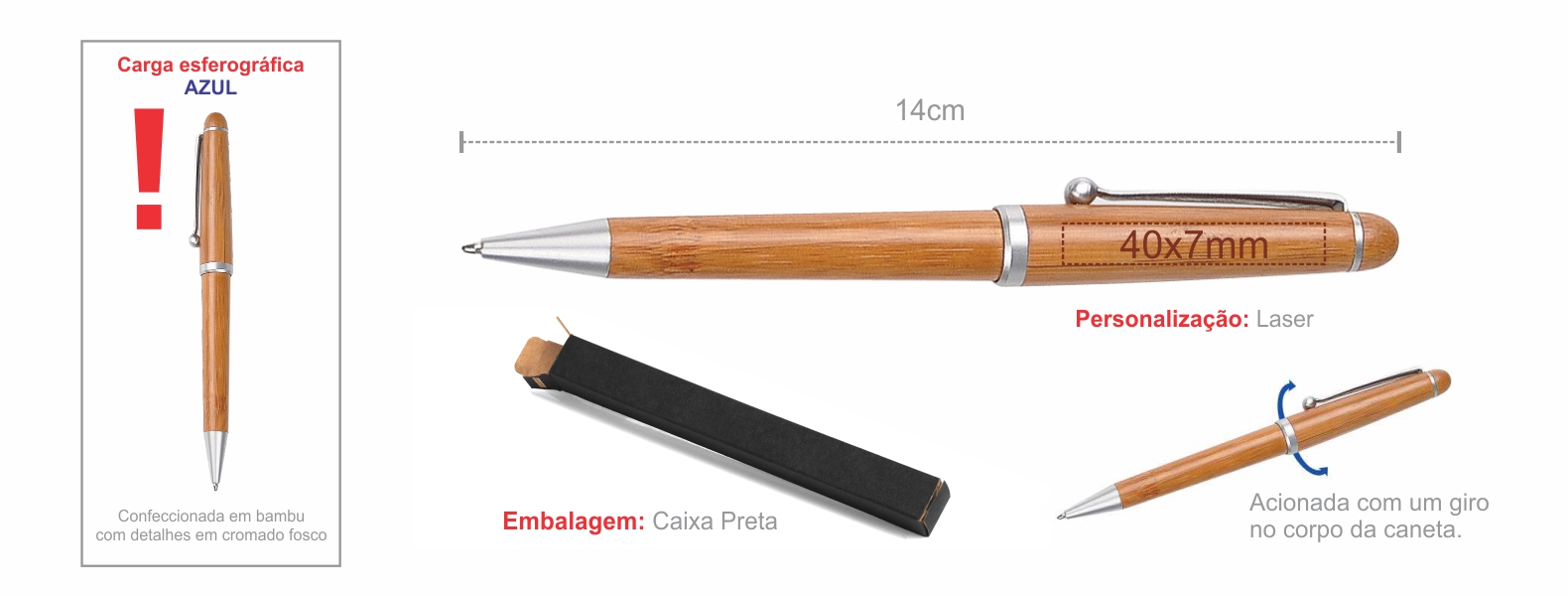 Confeccionada em Bambu ecológico com detalhes em cromado fosco, possui carga esferográfica azul. É acionada com um giro no corpo da caneta.