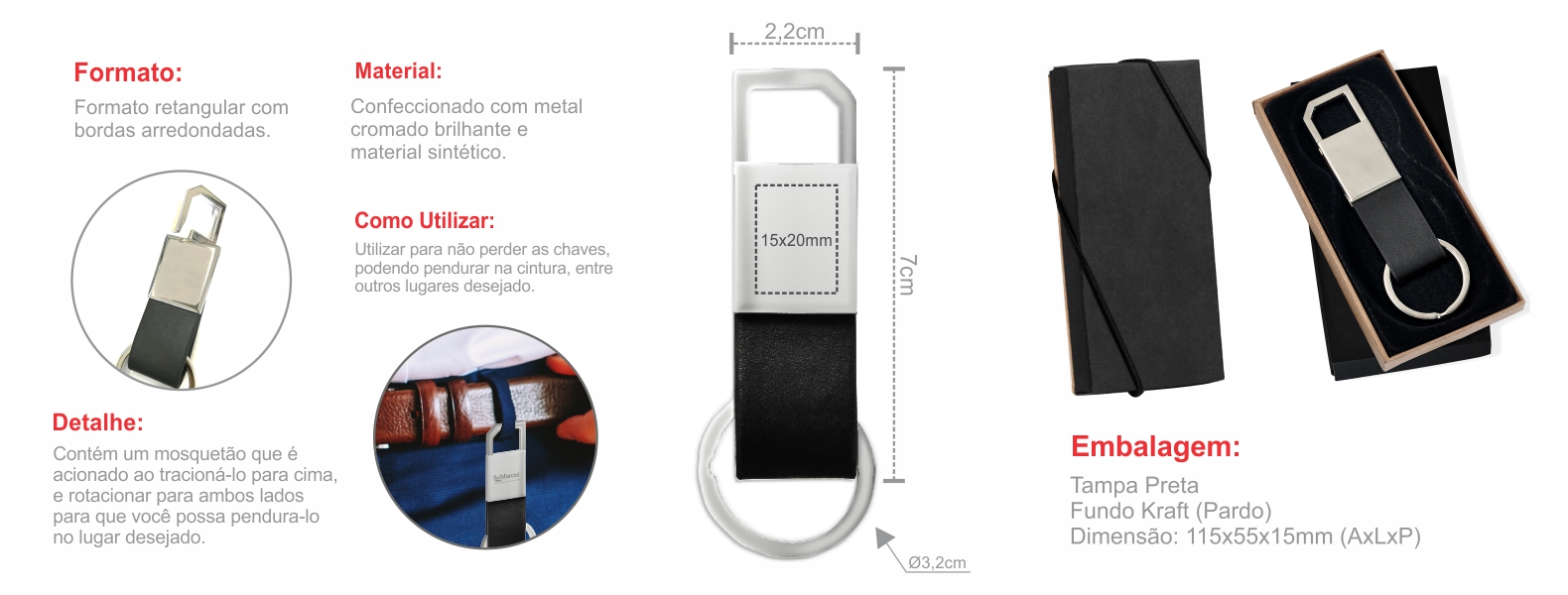 Confeccionado em metal cromado brilhante e material sintético preto, é estilo mosquetão, possui argola com Ø 3,2cm e está acomodado em uma embalagem interna aveludada e caixa kraft com tampa fechada em cordão elástico preto para presente.