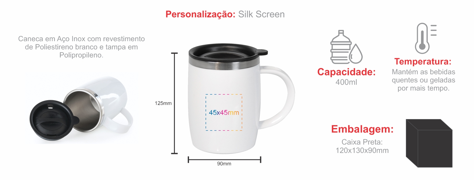 Caneca em Aço Inox com revestimento de Poliestireno branco e tampa em Polipropileno. Capacidade: 400 ml